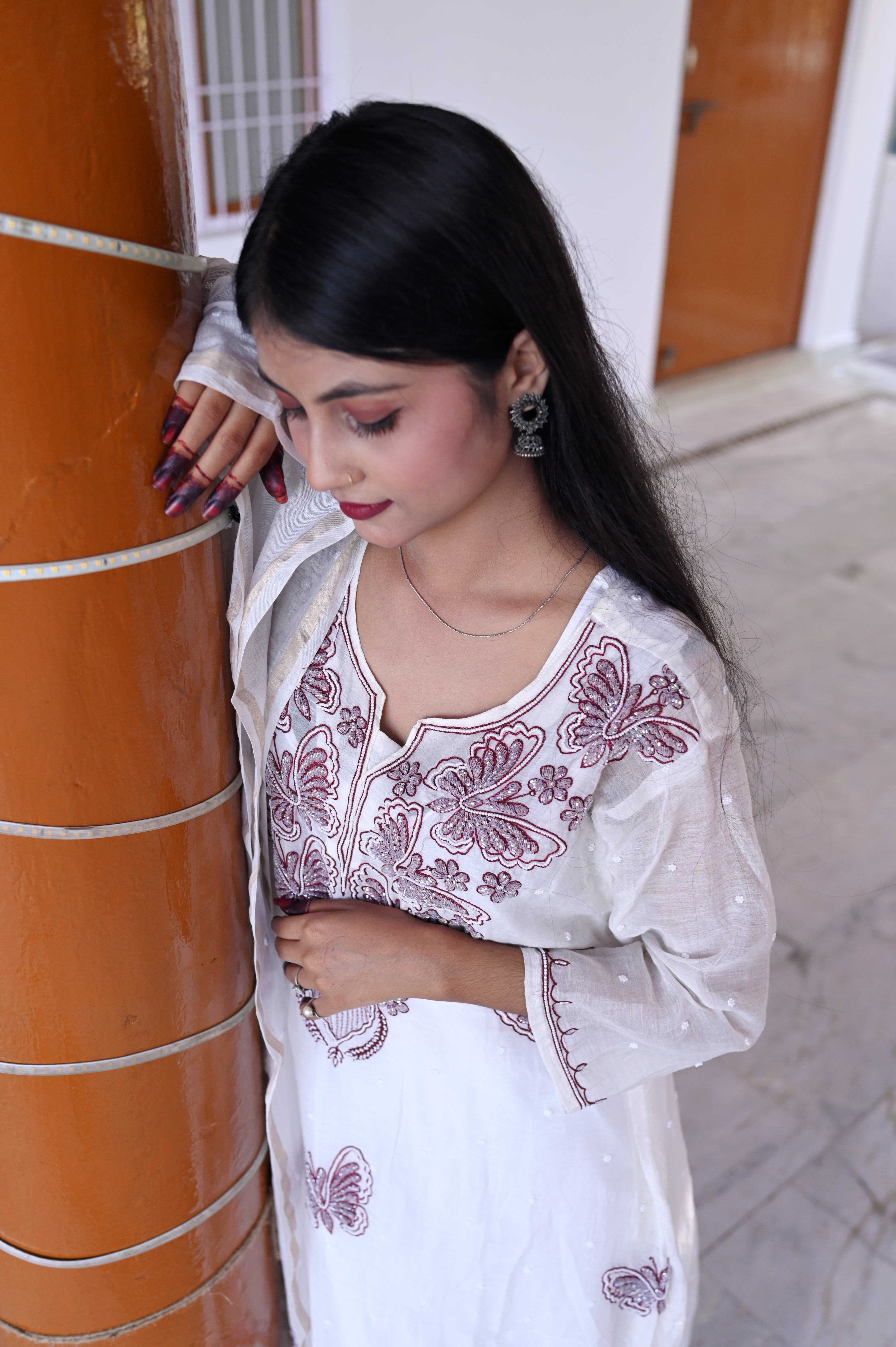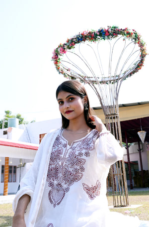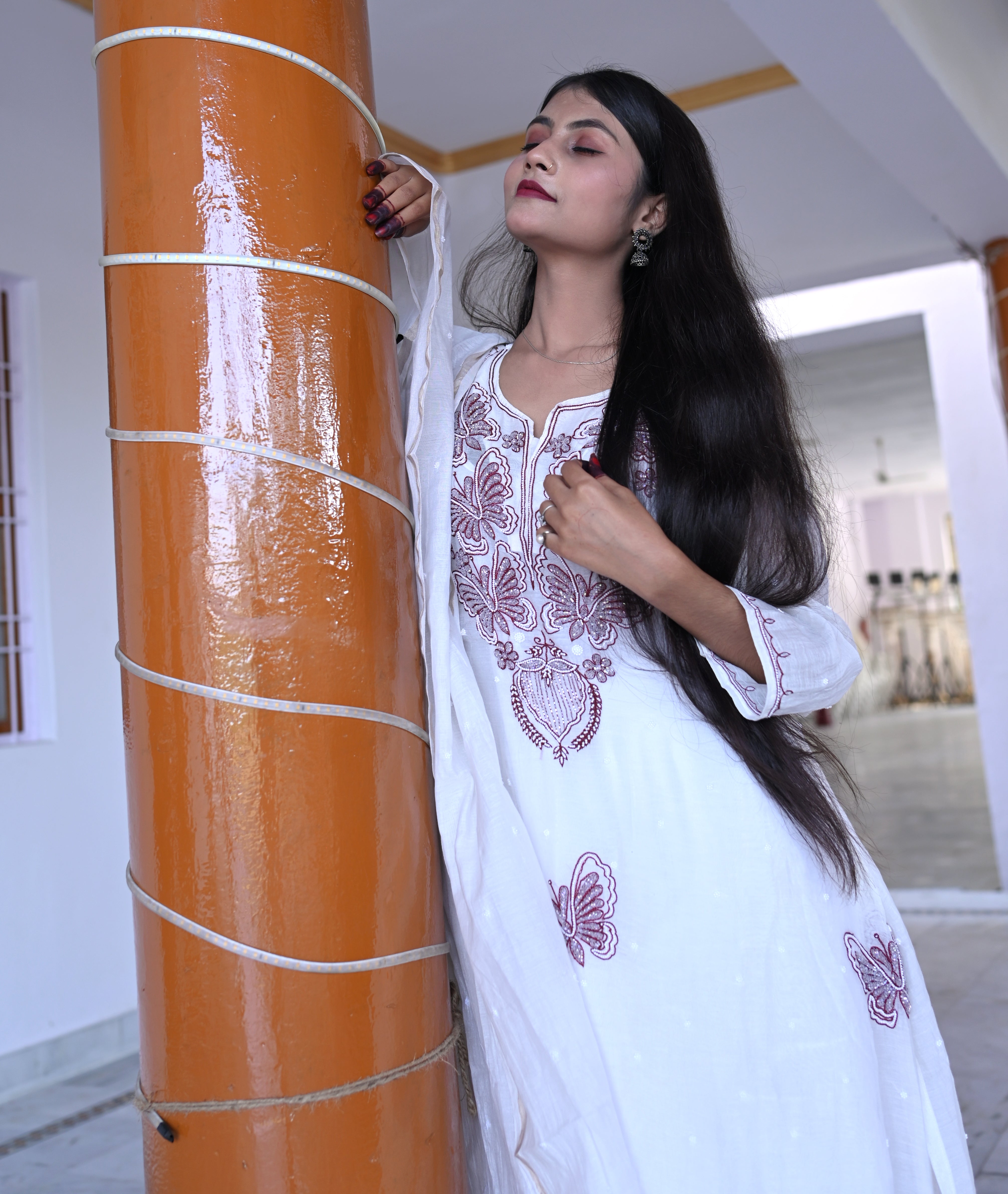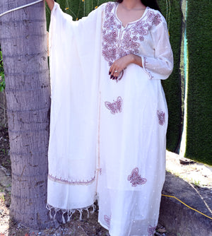 Crafted from the softest pure malmal cotton, the fabric feels feather-light against the skin while exuding a natural, graceful drape. Each motif is hand-embroidered by skilled artisans using fine resham threads, creating subtle textures and patterns that reflect authentic Chikankari craftsmanship.