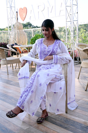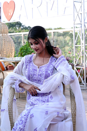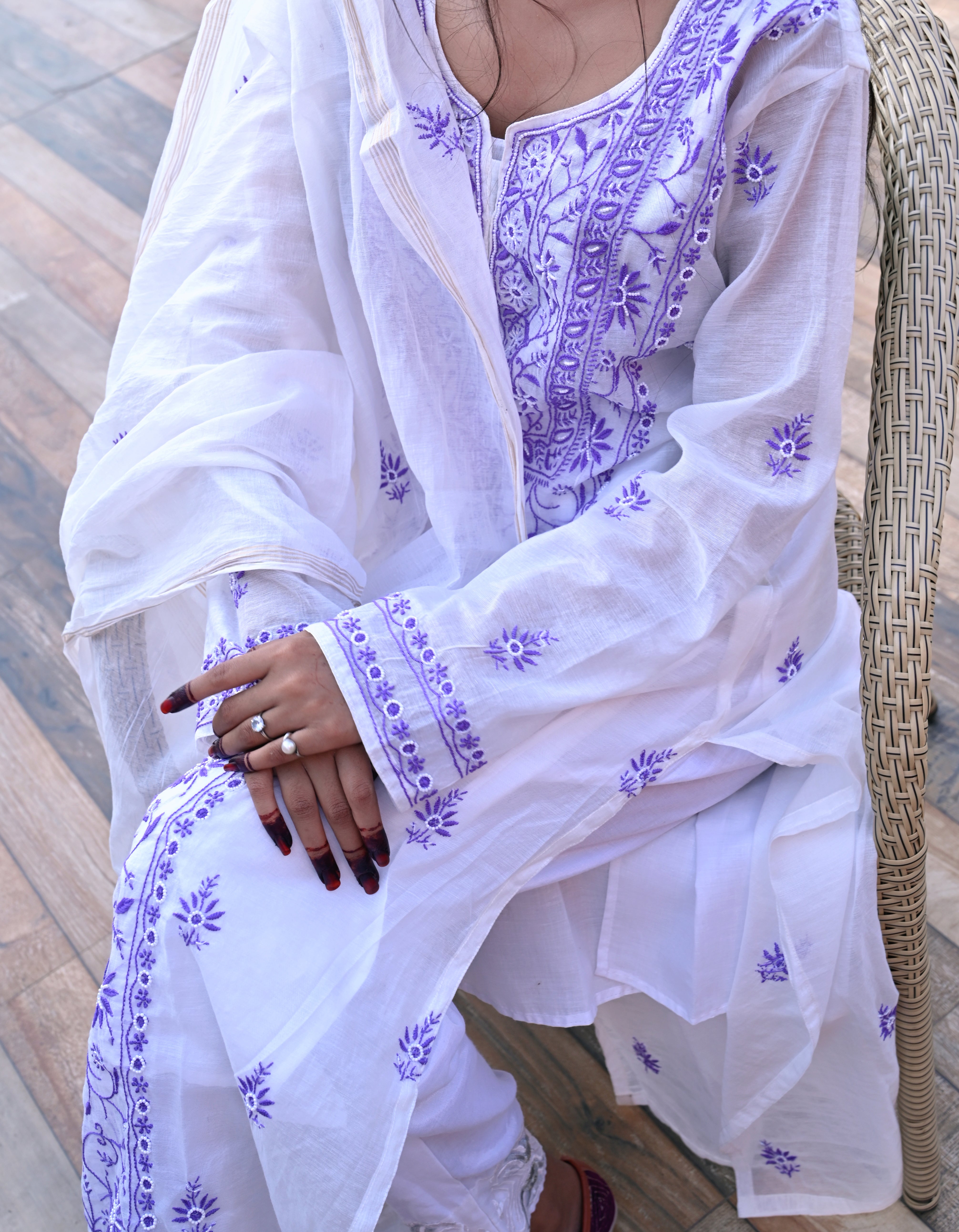 Step into a world of refined elegance with this Semi Malmal Chikan Kaari Panel Work Suit, beautifully hand-embroidered in purple resham threads and adorned with delicate pearl and cut dana embellishments. 🌸