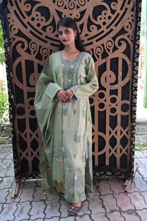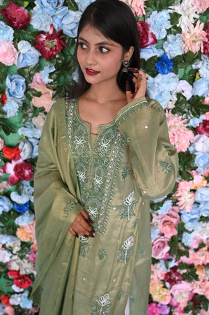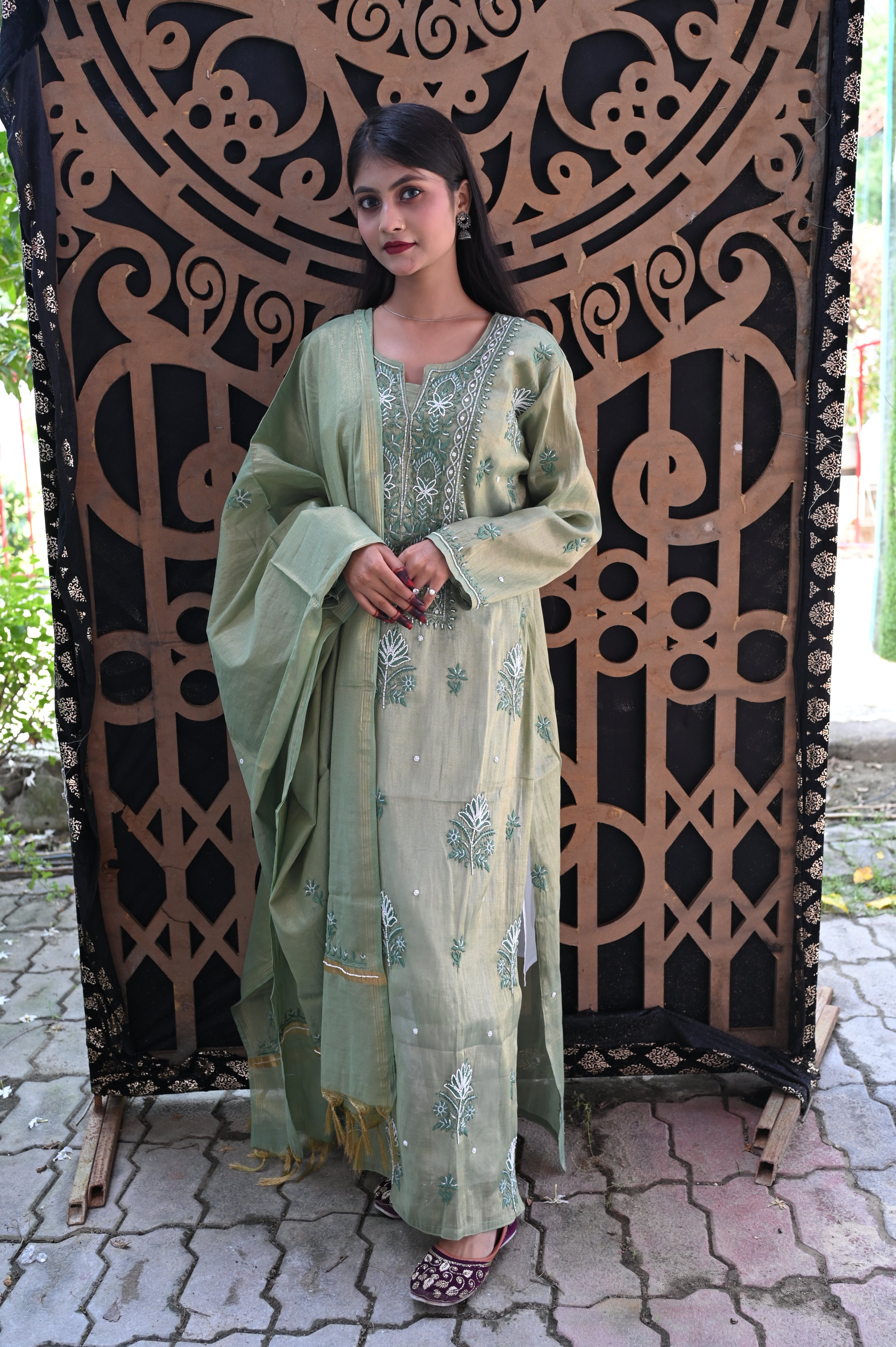 Step into the world of delicate craftsmanship with this Tissue Chikan Kaari Gala Buta Suit, exquisitely hand-embroidered and adorned with pearls and cut dana embellishments for a subtle, regal shimmer. 🌸